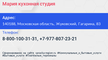Мария, кухонная студия по адресу 140188, Московская область, Жуковский, Гагарина, 83 в дальнейшем Организация, размещена в следующих категориях: