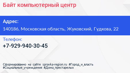 Байт, компьютерный центр по адресу 140186, Московская область, Жуковский, Гудкова, 22 в дальнейшем Организация, размещена в следующих категориях: