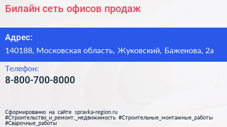 Билайн, сеть офисов продаж по адресу 140188, Московская область, Жуковский, Баженова, 2а в дальнейшем Организация, размещена в следующих категориях: