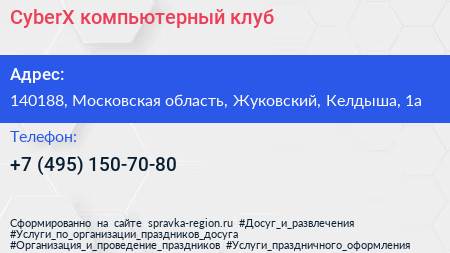 CyberX, компьютерный клуб по адресу 140188, Московская область, Жуковский, Келдыша, 1а в дальнейшем Организация, размещена в следующих категориях: