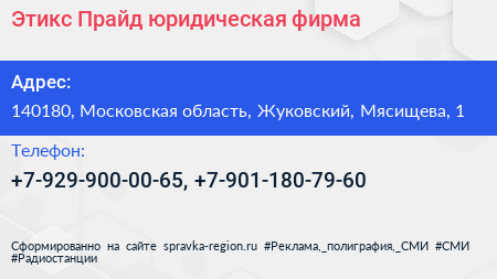 Этикс Прайд, юридическая фирма по адресу 140180, Московская область, Жуковский, Мясищева, 1 в дальнейшем Организация, размещена в следующих категориях: