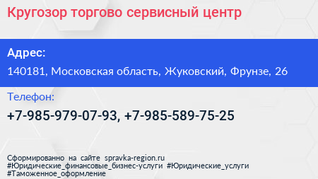 Кругозор, торгово-сервисный центр по адресу 140181, Московская область, Жуковский, Фрунзе, 26 в дальнейшем Организация, размещена в следующих категориях: