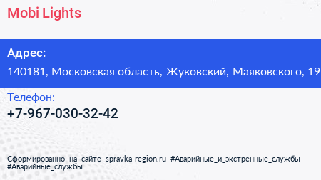 Mobi Lights по адресу 140181, Московская область, Жуковский, Маяковского, 19 в дальнейшем Организация, размещена в следующих категориях: