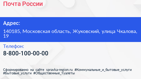Почта России по адресу 140185, Московская область, Жуковский, улица Чкалова, 19 в дальнейшем Организация, размещена в следующих категориях: