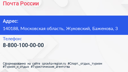 Почта России по адресу 140188, Московская область, Жуковский, Баженова, 3 в дальнейшем Организация, размещена в следующих категориях: