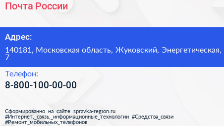 Почта России по адресу 140181, Московская область, Жуковский, Энергетическая, 7 в дальнейшем Организация, размещена в следующих категориях:
