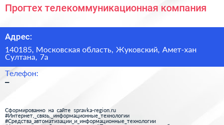 Прогтех, телекоммуникационная компания по адресу 140185, Московская область, Жуковский, Амет-хан Султана, 7а в дальнейшем Организация, размещена в следующих категориях: