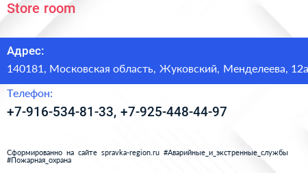 Store room по адресу 140181, Московская область, Жуковский, Менделеева, 12а в дальнейшем Организация, размещена в следующих категориях: