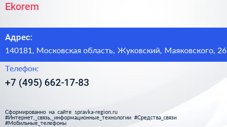 Ekorem по адресу 140181, Московская область, Жуковский, Маяковского, 26 в дальнейшем Организация, размещена в следующих категориях: