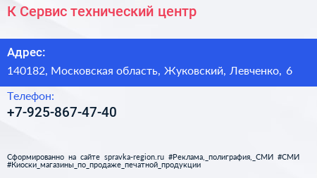К-Сервис, технический центр по адресу 140182, Московская область, Жуковский, Левченко, 6 в дальнейшем Организация, размещена в следующих категориях: