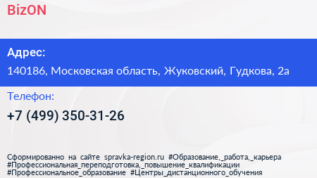 BizON по адресу 140186, Московская область, Жуковский, Гудкова, 2а в дальнейшем Организация, размещена в следующих категориях: