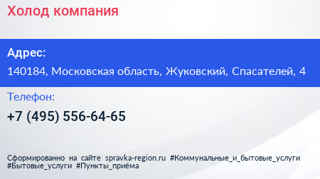 Холод, компания по адресу 140184, Московская область, Жуковский, Спасателей, 4 в дальнейшем Организация, размещена в следующих категориях:
