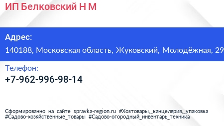 ИП Белковский Н.М. по адресу 140188, Московская область, Жуковский, Молодёжная, 29 в дальнейшем Организация, размещена в следующих категориях: