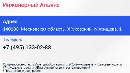 Инженерный Альянс по адресу 140180, Московская область, Жуковский, Мясищева, 1 в дальнейшем Организация, размещена в следующих категориях: