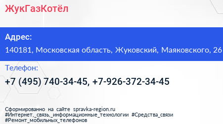 ЖукГазКотёл по адресу 140181, Московская область, Жуковский, Маяковского, 26 в дальнейшем Организация, размещена в следующих категориях: