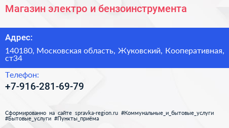 Магазин электро и бензоинструмента по адресу 140180, Московская область, Жуковский, Кооперативная, ст34 в дальнейшем Организация, размещена в следующих категориях: