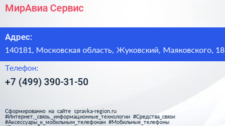 МирАвиа-Сервис по адресу 140181, Московская область, Жуковский, Маяковского, 18 в дальнейшем Организация, размещена в следующих категориях: