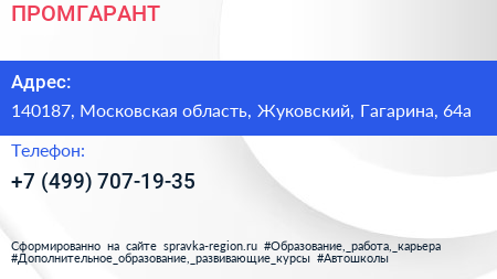 ПРОМГАРАНТ по адресу 140187, Московская область, Жуковский, Гагарина, 64а в дальнейшем Организация, размещена в следующих категориях: