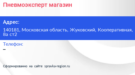 Пневмоэксперт, магазин по адресу 140181, Московская область, Жуковский, Кооперативная, 8а ст2 в дальнейшем Организация, размещена в следующих категориях: