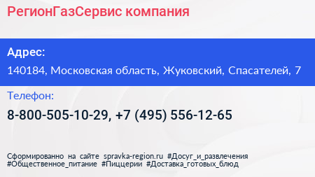 РегионГазСервис, компания по адресу 140184, Московская область, Жуковский, Спасателей, 7 в дальнейшем Организация, размещена в следующих категориях: