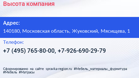Высота, компания по адресу 140180, Московская область, Жуковский, Мясищева, 1 в дальнейшем Организация, размещена в следующих категориях:
