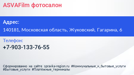 ASVAFilm, фотосалон по адресу 140181, Московская область, Жуковский, Гагарина, 6 в дальнейшем Организация, размещена в следующих категориях: