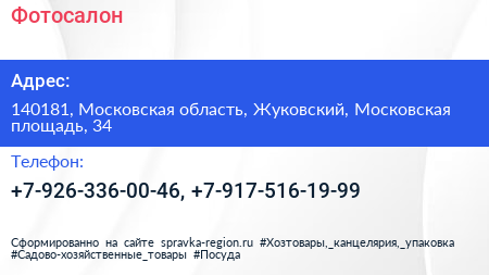 Фотосалон по адресу 140181, Московская область, Жуковский, Московская площадь, 34 в дальнейшем Организация, размещена в следующих категориях: