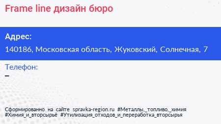 Frame-line, дизайн-бюро по адресу 140186, Московская область, Жуковский, Солнечная, 7 в дальнейшем Организация, размещена в следующих категориях: