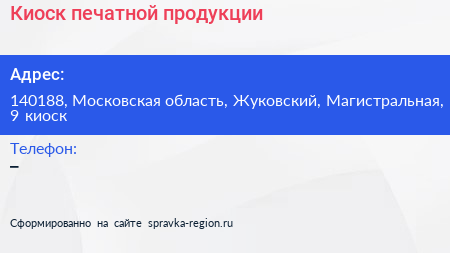 Киоск печатной продукции по адресу 140188, Московская область, Жуковский, Магистральная, 9 киоск в дальнейшем Организация, размещена в следующих категориях: