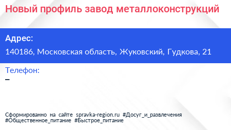 Новый профиль, завод металлоконструкций по адресу 140186, Московская область, Жуковский, Гудкова, 21 в дальнейшем Организация, размещена в следующих категориях: