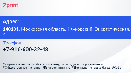 Zprint по адресу 140181, Московская область, Жуковский, Энергетическая, 7 в дальнейшем Организация, размещена в следующих категориях: