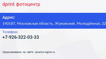 dprint, фотоцентр по адресу 140187, Московская область, Жуковский, Молодёжная, 22 в дальнейшем Организация, размещена в следующих категориях: