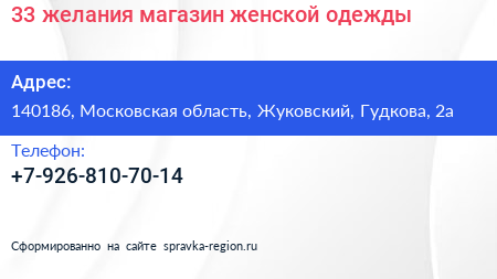 33 желания, магазин женской одежды по адресу 140186, Московская область, Жуковский, Гудкова, 2а в дальнейшем Организация, размещена в следующих категориях: