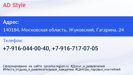 AD Style по адресу 140184, Московская область, Жуковский, Гагарина, 24 в дальнейшем Организация, размещена в следующих категориях: