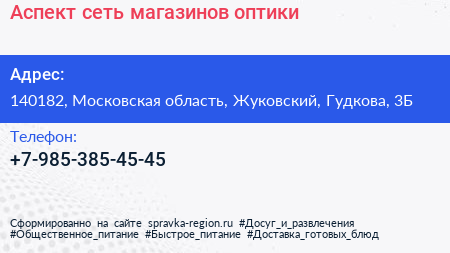 Аспект, сеть магазинов оптики по адресу 140182, Московская область, Жуковский, Гудкова, 3Б в дальнейшем Организация, размещена в следующих категориях: