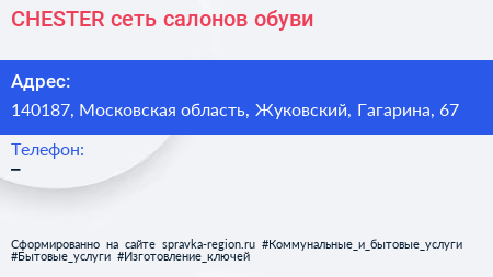 CHESTER, сеть салонов обуви по адресу 140187, Московская область, Жуковский, Гагарина, 67 в дальнейшем Организация, размещена в следующих категориях:
