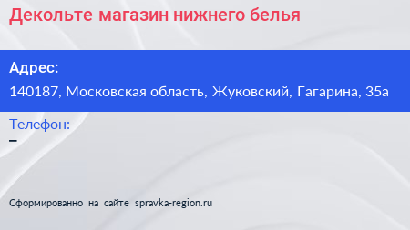 Декольте, магазин нижнего белья по адресу 140187, Московская область, Жуковский, Гагарина, 35а в дальнейшем Организация, размещена в следующих категориях: