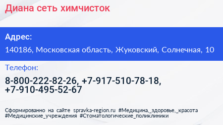 Диана, сеть химчисток по адресу 140186, Московская область, Жуковский, Солнечная, 10 в дальнейшем Организация, размещена в следующих категориях: