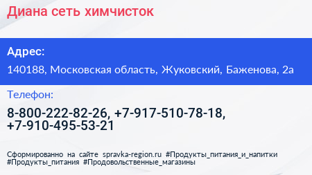 Диана, сеть химчисток по адресу 140188, Московская область, Жуковский, Баженова, 2а в дальнейшем Организация, размещена в следующих категориях: