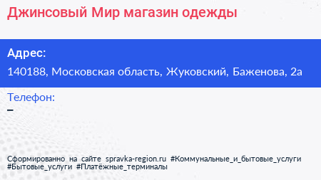 Джинсовый Мир, магазин одежды по адресу 140188, Московская область, Жуковский, Баженова, 2а в дальнейшем Организация, размещена в следующих категориях: