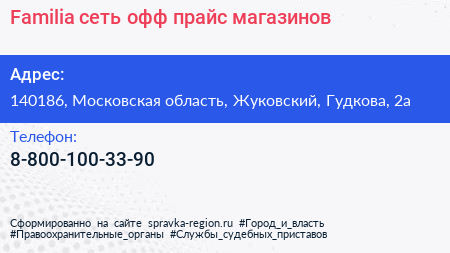 Familia, сеть офф-прайс магазинов по адресу 140186, Московская область, Жуковский, Гудкова, 2а в дальнейшем Организация, размещена в следующих категориях: