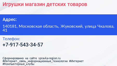 Игрушки, магазин детских товаров по адресу 140181, Московская область, Жуковский, улица Чкалова, 41 в дальнейшем Организация, размещена в следующих категориях: