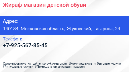 Жираф, магазин детской обуви по адресу 140184, Московская область, Жуковский, Гагарина, 24 в дальнейшем Организация, размещена в следующих категориях: