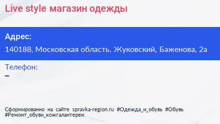 Live style, магазин одежды по адресу 140188, Московская область, Жуковский, Баженова, 2а в дальнейшем Организация, размещена в следующих категориях:
