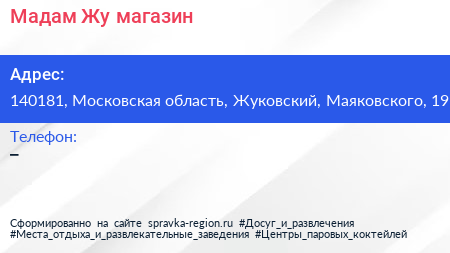 Мадам Жу, магазин по адресу 140181, Московская область, Жуковский, Маяковского, 19 в дальнейшем Организация, размещена в следующих категориях: