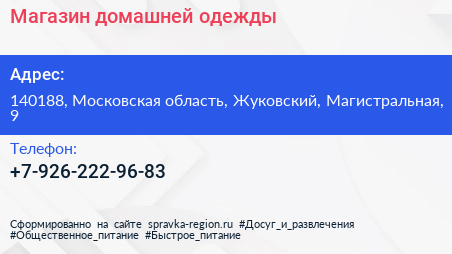 Магазин домашней одежды по адресу 140188, Московская область, Жуковский, Магистральная, 9 в дальнейшем Организация, размещена в следующих категориях: