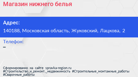 Магазин нижнего белья по адресу 140188, Московская область, Жуковский, Лацкова, 2 в дальнейшем Организация, размещена в следующих категориях: