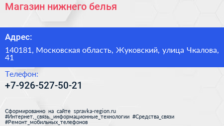 Магазин нижнего белья по адресу 140181, Московская область, Жуковский, улица Чкалова, 41 в дальнейшем Организация, размещена в следующих категориях: