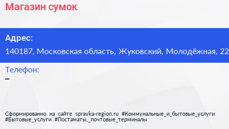 Магазин сумок по адресу 140187, Московская область, Жуковский, Молодёжная, 22 в дальнейшем Организация, размещена в следующих категориях: