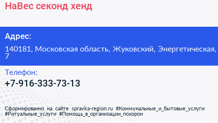 НаВес, секонд-хенд по адресу 140181, Московская область, Жуковский, Энергетическая, 7 в дальнейшем Организация, размещена в следующих категориях: